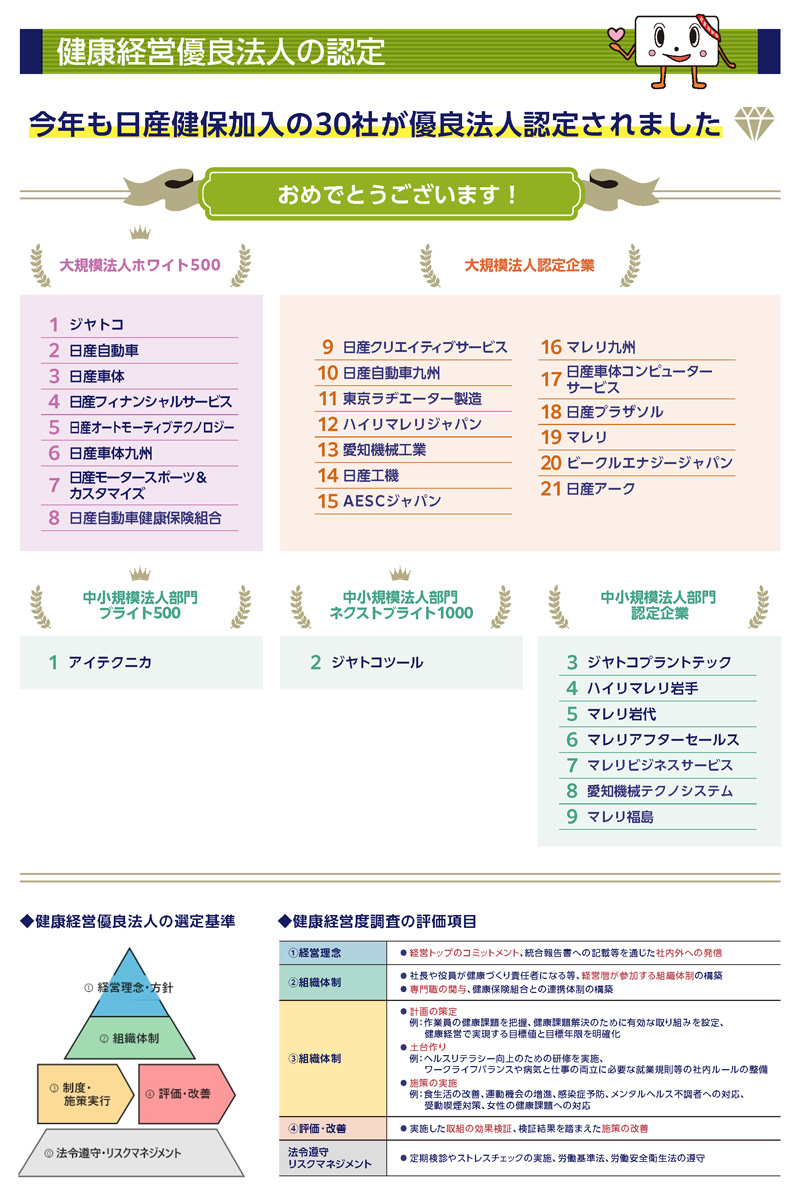 2026年3月、日本健康会議により「健康経営優良法人2026」として、日産健保加入の30社が「大規模法人部門」および「中小規模法人部門」において認定されました。